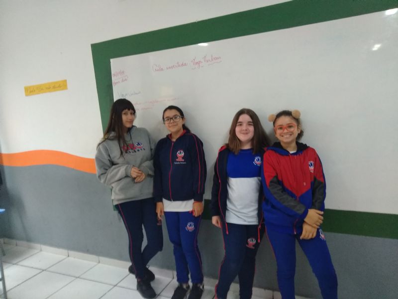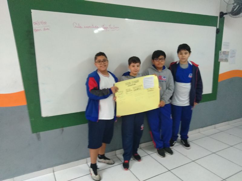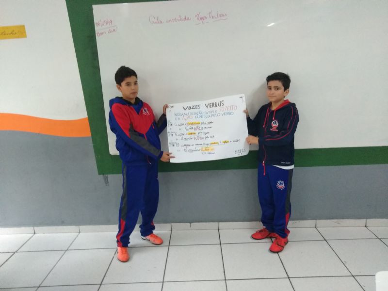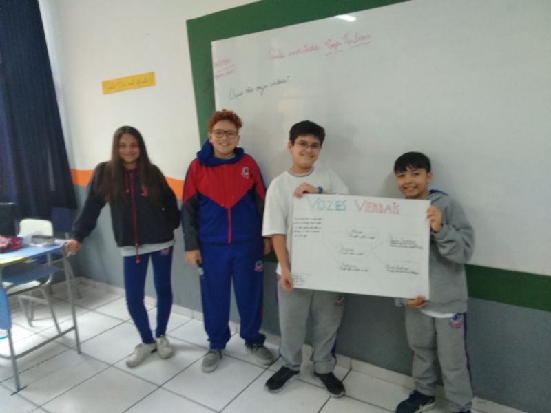 Os alunos fizeram em casa a pesquisa e a montagem da aula sobre as Vozes Verbais, as apresentações foram com cartazes e na lousa. No final teve a explicação da professora. Professora Ana Paula.